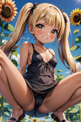 anime screencap,<lora:flat2:-0.5>,1girl,teenage,(short stature:1.3),(dwarf:1.1),petite,(kawaii:1.3),<lora:skin_tone_slider_v1:3>,(short blonde twintails:1.3),blunt bangs,(brown droopy eyes:1.3),<lora:beautiful_detailed_eyes:0.3>,medium breasts,cleavage,<lora:noribs_v11:1>,sundress,in greenhouse,decorative plant,