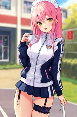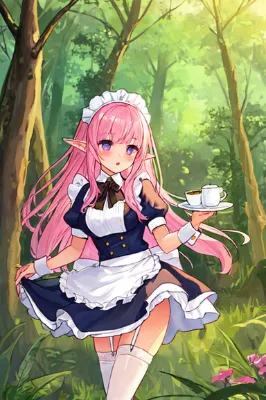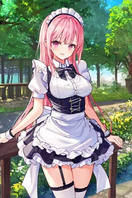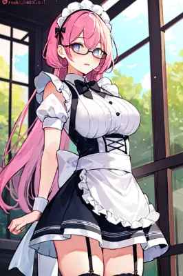 maid, long pink hair, cute odd-eye girl in a colorful mini skirt and maid outfit, with pink and purple eyes, showcasing her garter belt and ample bosom, surrounded by magical elements and a curse, in a cafe setting. High quality and high resolution image generation.