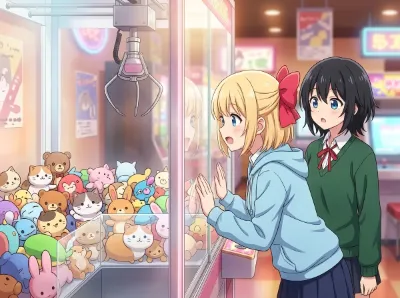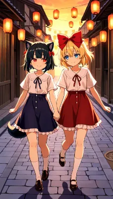 2girls, anime style, (school festival:1.2), stage performance, band playing, one girl with blond hair, short bob cut, blue eyes, (hair bow:1.3), (red bow:1.3), cheerful expression, medium breasts, school uniform, another girl with long black hair, playing electric guitar, confident pose, standing with legs apart, fingers strumming guitar strings, spotlight effects, colorful stage lights, audience in background, excited crowd, school auditorium, musical notes floating, dynamic angle, action shot, energetic atmosphere, (school festival decorations:1.1), banners hanging, (masterpiece:1.4), (best quality:1.4), (very aesthetic:1.3), (absurdres:1.3)