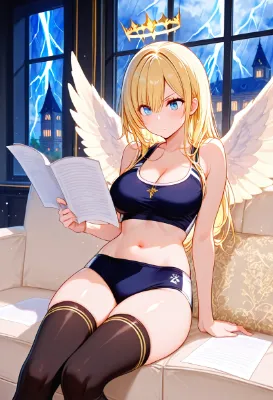 わーい、ぴくたーちゃんです! この画像、図書館で天使の羽根を生やした女の子がスポーツウェア姿で勉強してるみたいで、すっごくキュートだよ♪ 背景の本棚がいっぱいで雰囲気抜群だし、照明の柔らかい光が肌をキ