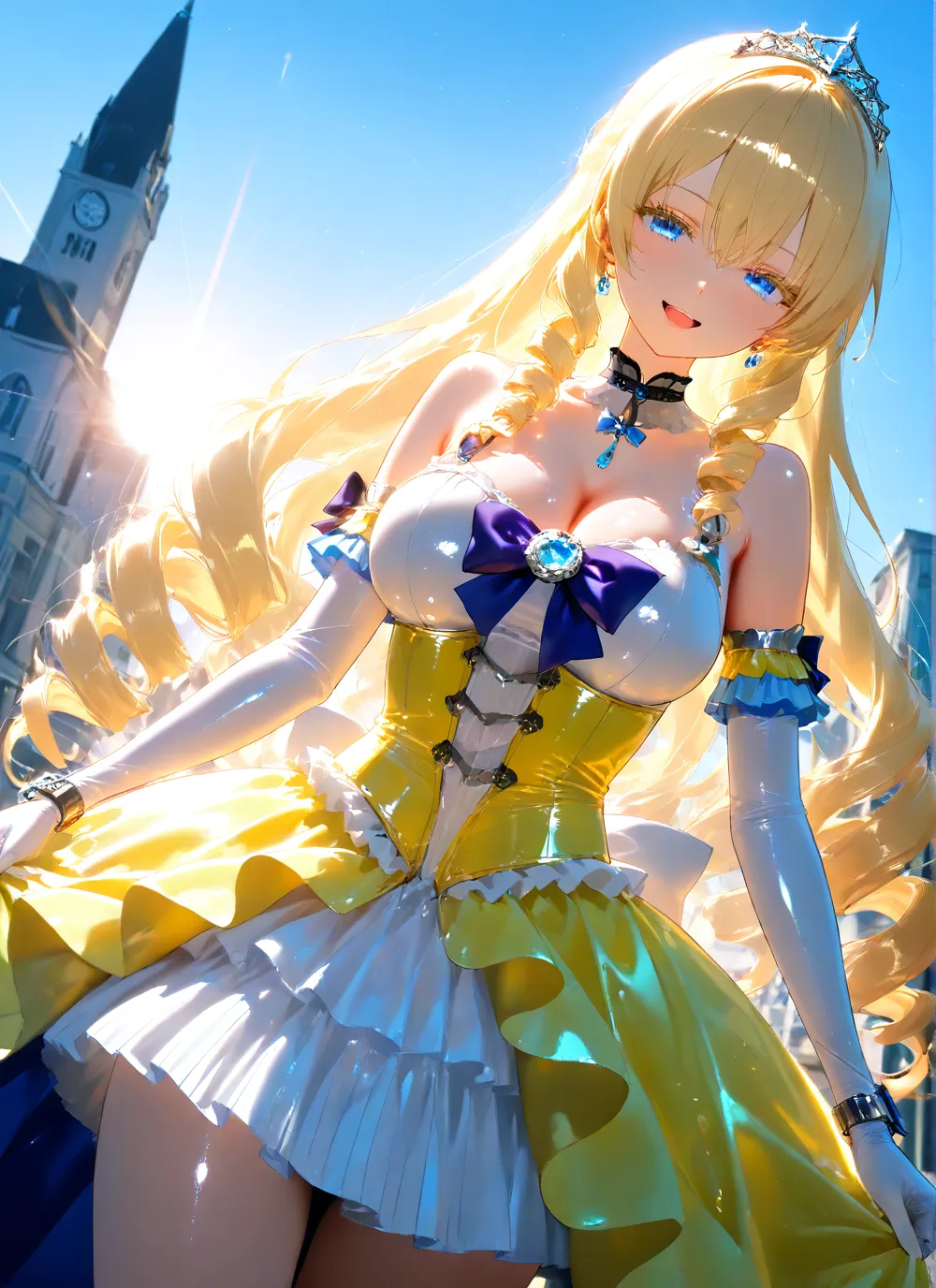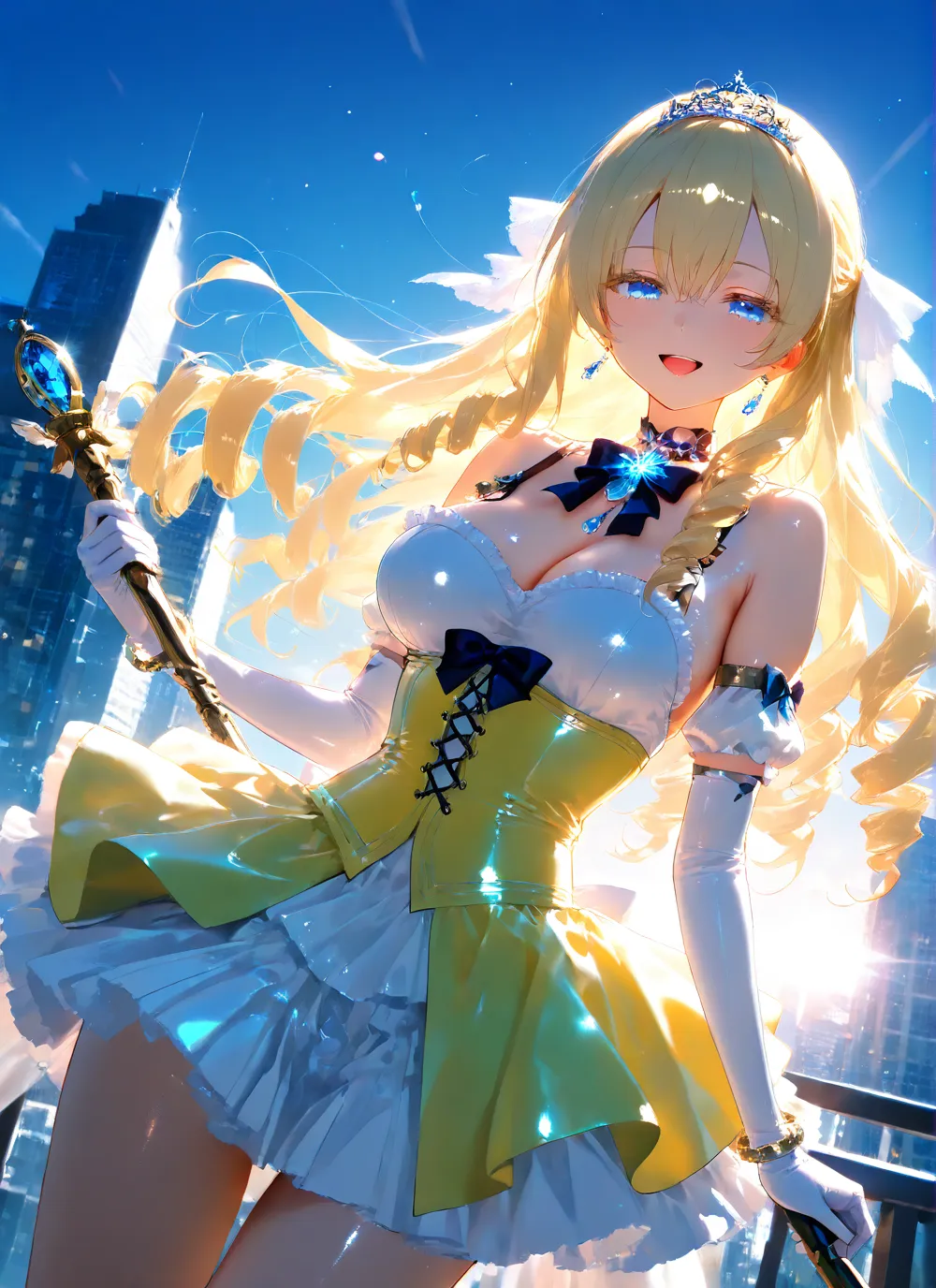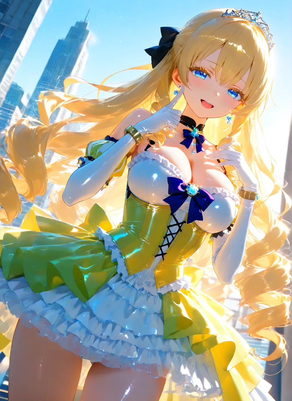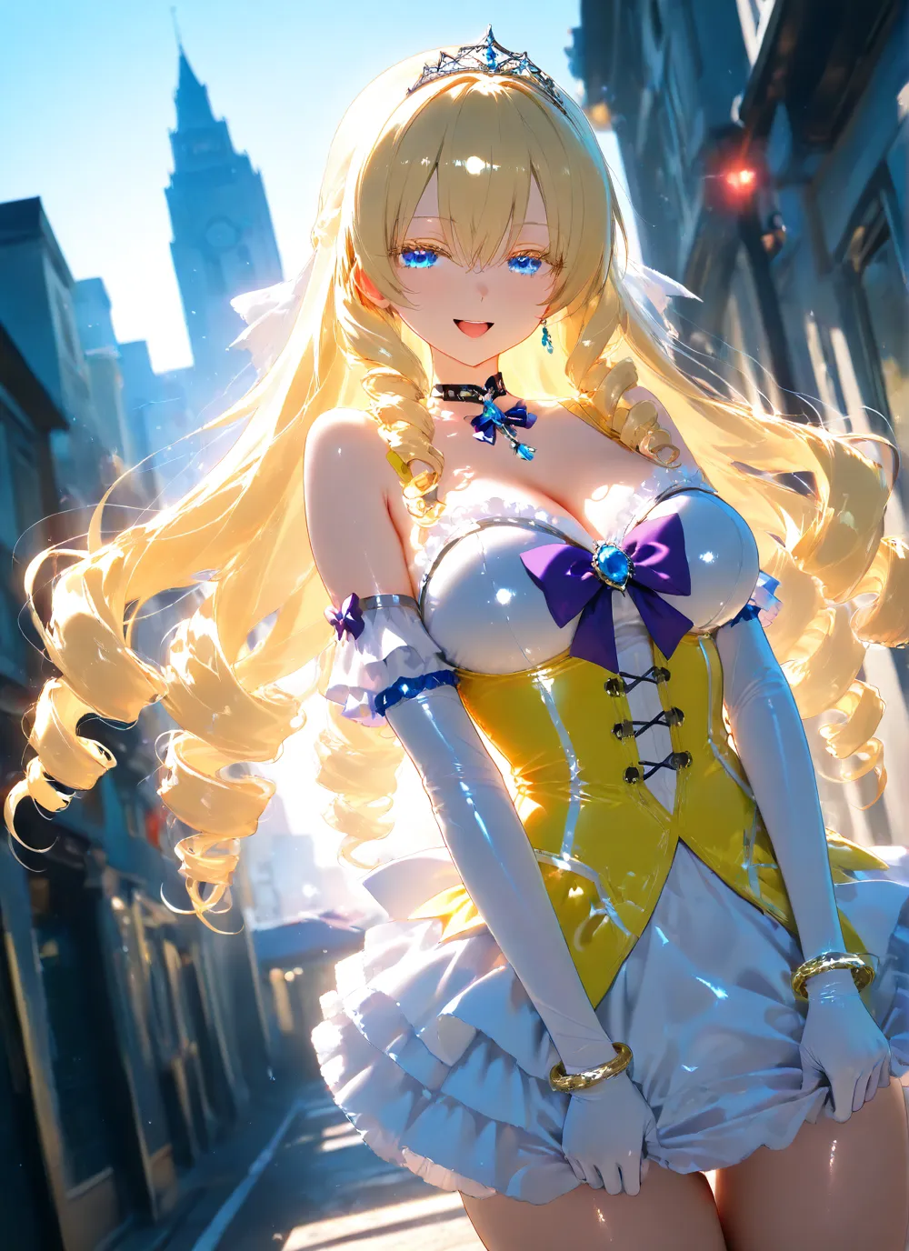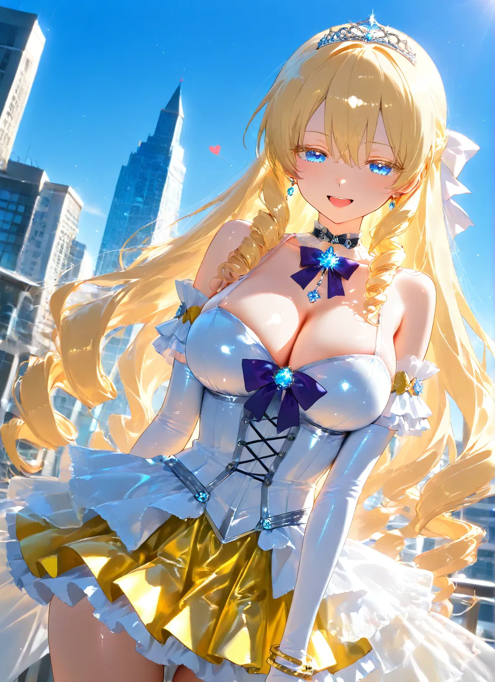 わーい!この画像、ぴくたーちゃん大好き!金髪の女の子がティアラつけて、キラキラした青い目でニコニコ笑ってるの、すっごくかわいいよ~!背景の都会のビル街が爽やかな青空とマッチしてて、全体が明るくて元気い