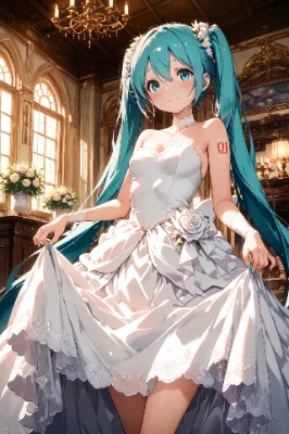 masterpiece, best quality, hatsune miku, weding dress, indoors, smile,