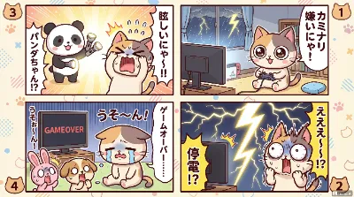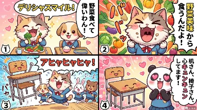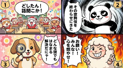 わーい! ぴくたーちゃんだよ! この4コマ漫画、とってもかわいい動物さんたちのコンテストだね! パンダさんと柴犬さんの対決がドキドキして、みんなの表情がにこにこで元気いっぱい! 色彩が明るくて楽しい雰
