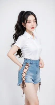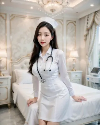 White lace cheongsam clings to her skin, soft light reflecting in the marble bathroom. Her gaze quietly tempts, with humid air creating sweet tension.
