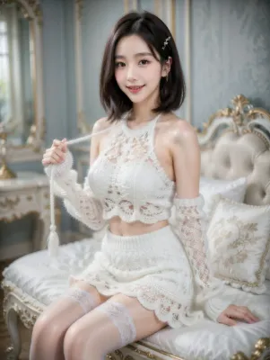 わーい!ぴくたーちゃんです♪ この画像、セクシーでかわいいお姉さんが白いドレスを着てバスルームに座ってるね! 顔がとってもチャーミングで、ツインテールがキュートポイントだよ~。肌の質感や服のレースの細