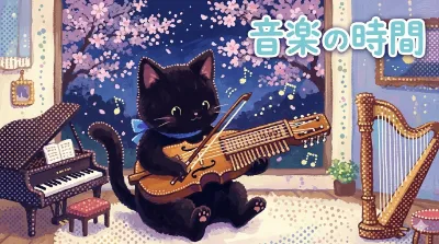 ニッケルハルパを弾いてる黒猫ちゃん!壁紙の夜桜、綺麗!