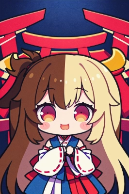 little girl, miko, miko costume, long hair, torii, perfect anatomy, masterpiece, absurdres, best quality, intricate details, best quality, 8k, best aethetic, beautiful art, ultra-detailed, illustration, ((kawaii)), cute, solo, smile, Two heads high