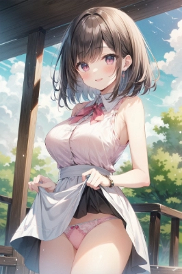 (exceptional, best aesthetic, new, newest, best quality, masterpiece, extremely detailed, anime, waifu:1.2), highres, absurdres, soft light, 1 girl, {happy smile}, blush, long eyalashes, large breats, bob haircut, brown hair, {waitress:1.2}, show off bra, pink bra, {wind blow:1.2}, {skirt lift lifted by wind}, {pink panties}, wearing, looking at the viewer, cafe