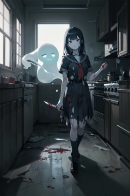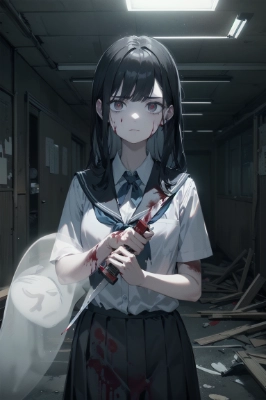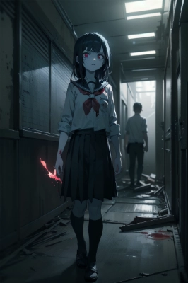 masterpiece, best quality, best quality drawn, (a ghost girl), ((bloody large torn school uniform)), female high school student, (pale blue skin), black hair, red eye, expressionless face, ((holding a bloody kitchen knife)), slender body, midnight, pitch darkness, indoors, (dark abandoned ruined school corridor in Japan), horror, footage from a surveillance camera, interior photo, realistic illustration, insanely detailed, Documentary, (ghost in distance), ((moody lighting)), ((blood splatter)),,