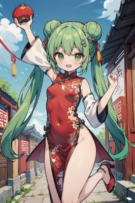 masterpiece, best quality, extremely detailed, anime, girl, skirt1girl, red footwear, underwear, dress, hair bun, long hair, green eyes, double bun, breasts, chinese clothes, solo, armpits, red dress, sleeveless, (china dress:1.5), green hair, bare shoulders, very long hair, standing, looking at viewer, open mouth, leg up, day, sleeveless dress, outdoors, standing on one leg, medium breasts, sky, architecture, east asian architecture, twintails, shoes, thighs, blue sky, blush, bangs, sidelocks, bare legs, cloud, flats, gold trim, pelvic curtain, small breasts, paper lantern, outstretched arm, high heels, arm up, bare arms, wide sleeves, building, hair ornament,