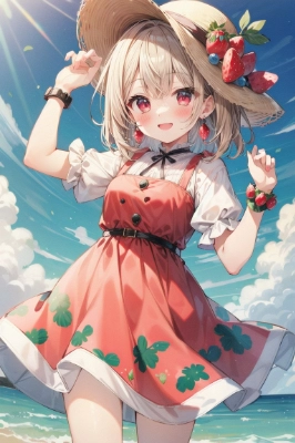 strawberry-themed, girl, fruity, cute, vibrant, red, sweetness, playful, joyful, summer, berry, strawberry dress, fruity accessories, smiling, cheerful, youthful, strawberry hat, fun, lively, delicious, freshness, fruity charm, adorable, charming, whimsical, strawberry earrings, carefree, strawberry pattern, lively, summery, delightful, strawberry-themed outfit, happiness, strawberry dreams,