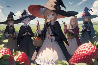 masterpiece, best quality, best quality drawn, five anime girl, silent witch, witch hat, witch clothes, witch cloak, blond hair, magic wand, (((five witches))), Halloween, (Stuffed bear holding a strawberry), outdoor, strawberry field, blue sky, ultra detailed, (((five witches in strawberry mark witch hat and witch clothes))), basket with strawberries,