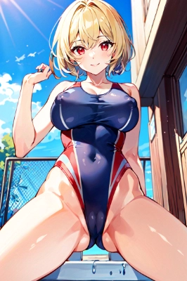 masterpiece, best quality, extremely detailed, anime, shorthair, thin yellowish hair, red eyes, girl, very big breasts, red ribbon on the left, erect nipples, smile, In town, Open your crotch and show it off, put hand on crotch, open legs, put your hand on your crotch, red competition swimsuit,,