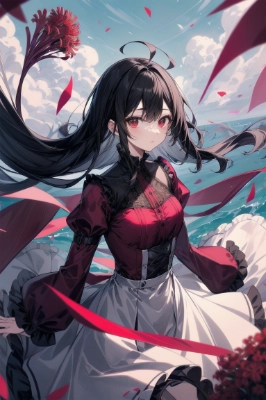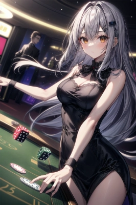 red black yellow dresssilver-haired girl,Her long hair is tousled in the wind,dice hair ornament,dice casino,<lora:flat2:-0.55> <lora:hairdetailer:0.45> ,