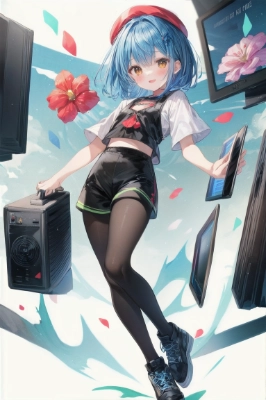 ((masterpiece, best quality, absurdres)), (pale colors:1.2), Clarity, (black tights:1.2), slim body, (short bob:1.4), blue hair, (no inner color:1.4), (no underlayer:1.2), flat chest, dark yellow eyes, red shorts, (short pants over tights:1.4), many flower, smile, top of head, travel, travel bag, cardigan, <lora:asb-CH1:-1> <lora:asb-CH2:-1>,