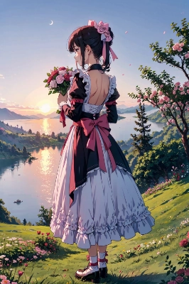 A beautiful woman in her 30s wearing a maid outfit standing with a bouquet on a hill overlooking a lake in the distance, short sleeve luster shiny black latex maid: 1.4, ( a girl holding a red rose and pink rose bouquet with white packing),