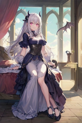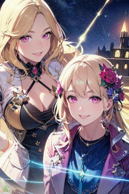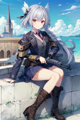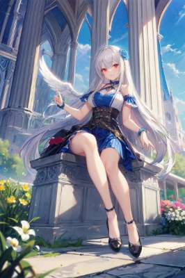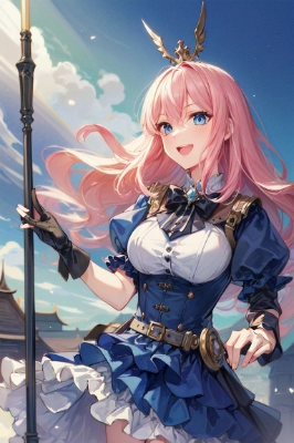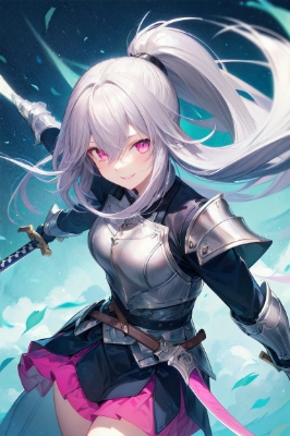 masterpiece, best quality, extremely detailed, anime, girl, skirt <lora:flat2:0> <lora:hairdetailer:1> , sword, a pretty woman, ponytail, silver hair, pink eyes, female knight, colorful, magic, wing, different world, smile, fighting, sword fighting,