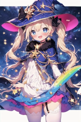 2girls, aurora, black headwear, blonde hair, blue eyes, blue headwear, blush, bow, cape, constellation, constellation print, crescent, crescent moon, diffraction spikes, dress, galaxy, garter straps, hat, long hair, looking at viewer, mona \\(genshin impact\\), moon, multiple girls, night, night sky, open mouth, planet, print headwear, rainbow, roman numeral, saint quartz \\(fate\\), shooting star, sky, space, sparkle, sparkle background, sparkling eyes, star-shaped pupils, star \\(sky\\), star \\(symbol\\), star choker, star earrings, star hair ornament, star print, starry background, starry sky, starry sky print, tarot, thighhighs, twintails, wand, white legwear, witch, witch hat ,