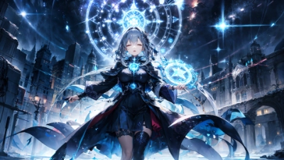 (night sky,milky way,starry sky,atmosphere, space),(majestic mountain),vast expanse of stars,shooting stars,nebulas,cosmic beauty,(1girl,solo, magical girl:1.2),cute,kawaii,(young wizard or sorceress:1.2),(magic circle,magic square),floating (book),glowing runes or symbols around her,chanting,energy waves emanating,ambient glow from her magic,whispers of ancient spells,atmosphere charged with magical essence,ground covered in mystical symbols or patterns,glowing energy balls,great magic,