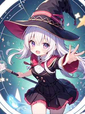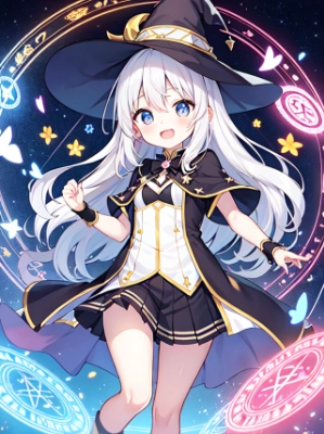 (magican, witch hat, magic circle, hexagram:1.2), long hair, silver hair, (light novel, SSR:0.8), (fighting, dynamic action), bare thigh,