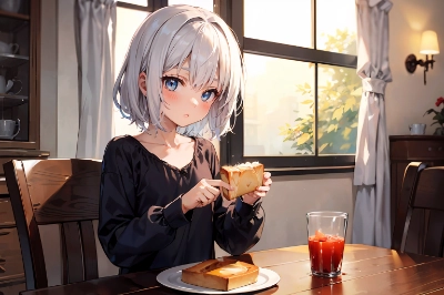 very cute female child,10 yo,white hair,bangs,medium hair,blue eyes,flat chest,black pajamas,messy hair,sitting,