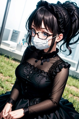 ((detailed facial features)), ((perfect female figure)), ((perfect anatomy)), ((masterpiece)), ((best quality)), ultra detailed, high resolution:1.8, intricate detail, ultra detailed skin, (cute1.4), (black Lolita fashion:1.5), (gothic lolita fashion:1.5), (black dress:1.5), (opera glove:1.4), (black surgical mask:1.5), (smiling ):1.5, (1girl:1.5), (solo:1.5), BREAK (black hair:1.5), high ponytail, hair over eyes, brown eyes, detailed face, beautiful eyes, (slanted eyes:1.2), large breasts, glasses, stilettos, <lora:flat2:-0.5>, BREAK profile, looking at another, wearing shoes, feet focus, squatting, selfie, put her finger on one’s lips, arms behind back, knee high boots, cloudy, grass field