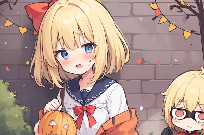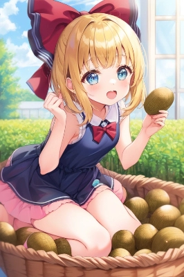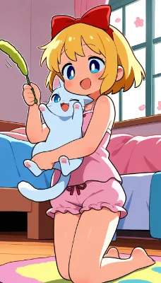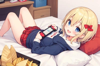1girl, loli,blond hair,short hair,hair bow,red bow,blue eyes,on back, lying, bedroom, holding, smile, open mouth, (potato chips:0.5), food phone, long sleeves, handheld game console,holding chips (food), bag of chips, hood,smile,