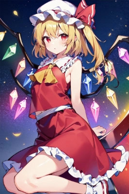 (masterpiece, best quality, ultra high res, 8k, perfect anatomy, extremely detailed), ((touhou project)), (((Flandre Scarlet)))BREAK(lo-li:1.3), (petite), (cute:1.3), (little:1.3), (kawaii:1.3), (1girl, cute girl, shiny body, shiny skin, small breasts), (gold hair, medium hair, side tail, crimson eyes), pink ZUN hat,BREAKred clothes, red sword, night, red moon,