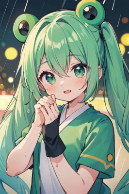 An image captured with the Tamron SP 45mm F1.8 Di VC USD lens. An upper body portrait of a happy anime Girl (2023s style) wearing a frog costume and making cute pose. vivid bokeh lighting and rain --ar 3:2 --niji 5green hair long wavy hair twintails.hairs between eyes,green eyes ,