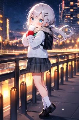 masterpiece, best quality, transparent illustration, 1girl, ((((loli)))), 9 yo, 8yo, baby face, cute kawaii female child, hands over own mouth, (white mittens), white scarf, blush, breath, looking down, looking at another, dark-gray gradient hair, long hair, shoulder length hair, hairclip, finely detailed beautiful eyes, blue eyes, standing, full body, from side, profile, school uniform, black mini plaid skirt, (thick thighs:0.9), black socks, brown loafers BREAK bright night, urban park, bright buildings background, beautiful city, night view, neon lights, city lights are beautiful, canal, (snowing:0.4), dynamic angle, perspective, wide shot, caustics <lora:flatBG:-0.3>