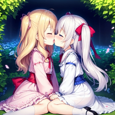 masterpiece best quality extremely detailed anime ((((little female child)))) ((loli)) ((toddler)) two side up long blonde hair long silver hair pink ribbon sash white dress lace-trimmed embroidery see-through long sleeves pink sash (closed eyes) sitting floral garden from side embarrassed blush looking at each other kiss french kiss drool saliva hugging each other blue eyes,