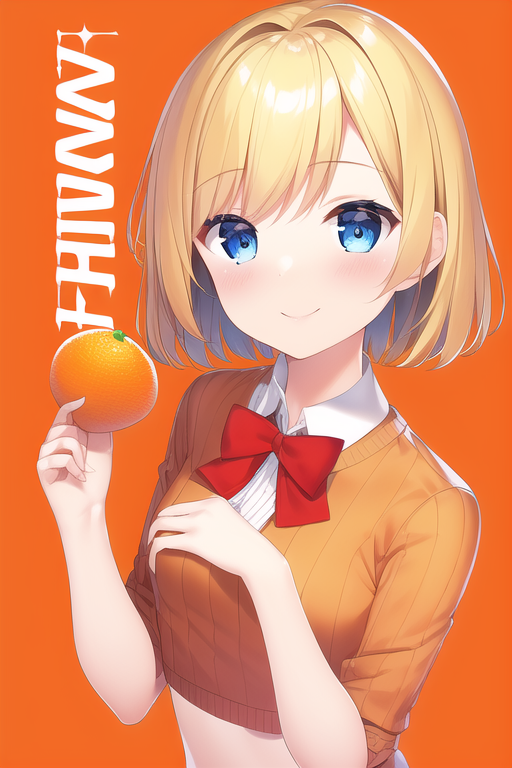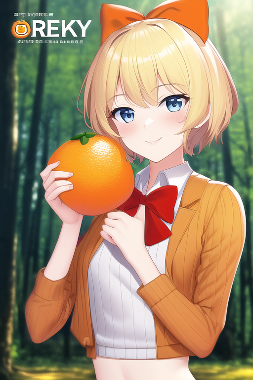 masterpiece, best quality, {{{{{campaign poster}}}}},girl,kind smile,blue eyes,{{{{{tareme}}}}},{ flat chest,{{{short hair}}}, blonde hair,{{hair red bow}},cropped jacket,ribbed sweater,{{{{{holding orange}}}}},forest,extremely detailed CG unity 8k wallpape,{{{masterpiece}}}