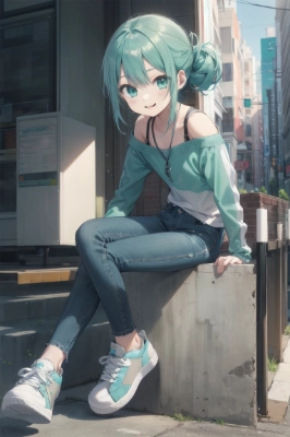 masterpiece, best quality, highres, 1otoko no ko, off-the-shoulder top, jeans, sneakers, かわいい, flat chest, aqua hair, aqua eyes, half updo, smile, drinking orange juice, vending machine<lora:flat2:0> <lora:hairdetailer:0.5>,