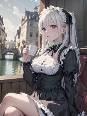 She is wearing a Gothic Lolita dress with (many frills:1.6).
