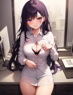 masterpiece, best quality, ultra-detailed, 1 girl, dark purple long hair, purple eyes, sharp mature face, seductive smile,cleavage, open breasts,medium breasts, white blouse, busyness suits, in office, slipped bra <lora:PaizuriInvitation:0.8>