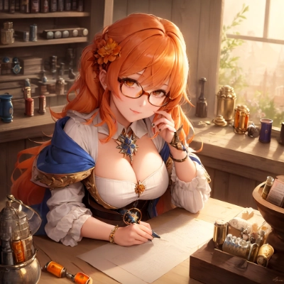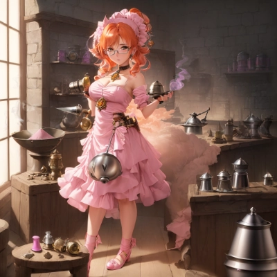 ((masterpiece,best quality,ultra detailed))Fantasy,beautiful girl,fluffy orange hair,round frame glasses,Alchemist’s Garb(expressionSurprised1.0)alchemist,(a mortar and pestle:1.4)(doing pharmaceuticals pink Smoke comes ou:1.3)Warm Light,mystic potion,(medicine bottle:1.0)