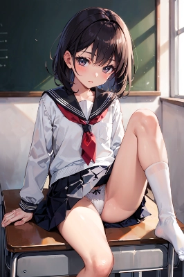 very cute female child,10 yo,shiny hair,flat chest,school uniform,long sleeves,sitting school desk,holding leg,