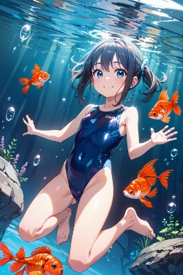 masterpiece, best quality, highres, ultra detailed, (kawaii:1.2), 1girl, (loli:1.25), (petite:1.25), <lora:Squeezer2:1> swimming, underwater, air bubble, blue theme, (floating:1.15), (floating hair:1.25), bubble, caustics, (goldfish:1.35), fish, fisheye, (partially underwater shot:1.25), smile, solo, <lora:raveclothesv1:1> rave clothes, one-piece swimsuit