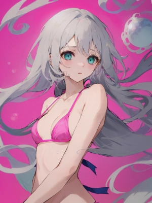 1 girl,(silver hair), messy long hair,aqua eyes,15 years old,pink background,lots of big soap bubbles