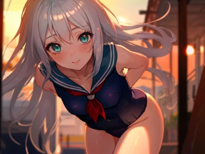 1 girl,(silver hair), messy long hair,aqua eyes,15 years old,delicate eyes,smile,Shopping street with a cafe,sunset