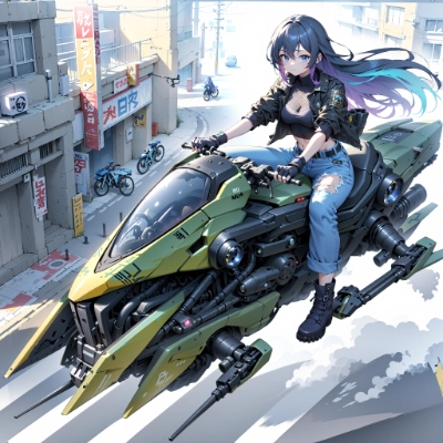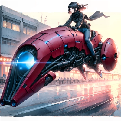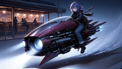 High-definition anime-style illustration of a girl riding a slender, sci-fi mechanical vehicle, similar to a flying saury but with a more angular design, viewed from a diagonal front angle. The vehicle features a narrow, elongated seat integrated into its top, creating a large concave area, with the seat occupying most of the upper surface. The overall width of the vehicle is about 50 cm, designed for easy maneuvering in tight spaces with minimal components on the sides. The scene is set in front of a bar on a winter night, with the sci-fi mechanical vehicle hovering stationary without any support like stands or landing gear. The front end tapers with a headlight. The vehicle is a dark metallic red, with some areas where the paint has chipped off. The girl is wearing denim pants, a black turtleneck, a leather rider's jacket, and a scarf for warmth. She has long blue hair tinged with purple, reaching down to her back, and is smoking a cigarette.