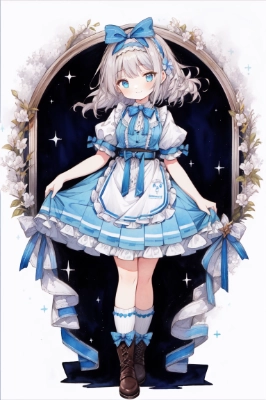 プロンプトは私のオリジナルではありません 衣装部分のみは↓コチラ ”light blue dress with frills, alice band, socks, brown boots, ribbon, (Bowknot ribbon belts:1.2), white apron, frilled legwear, frills ornament, hair ribbon, ribbon thigh highs, alice in wonderland”