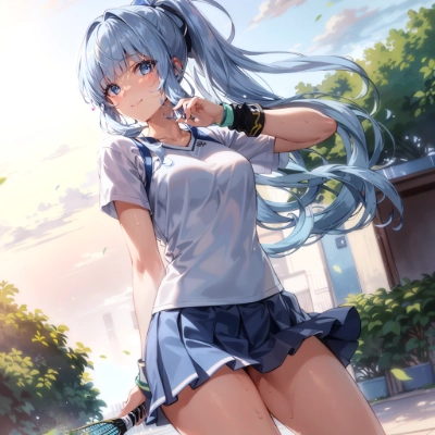 hires, cinematic angle,beautiful face,finely detail, masterpiece, best quality, ultra-detailed,Photorealistic,8k,lens flare,intense shadows,Studio,game cg,official art,fantasy,1girl, solo,cowboy shot,looking at viewer,<lora:flat2:-0.4>,<lora:ganyu2ep10_0.85dim32:0.8>,(ganyudef:0.5),ganyu \(genshin impact\),(long hair,pony tail,light blue hair,ahoge,messy hair,vermilion eyes,goat horns with red line:1,2),smile,sweat,(standing, holding a tray in the hand:1.2),(waitress,:1.2),(shorts,bikini top,:1.3),hair flower,(seaside restaurant,:1.4),beautiful beach,many food on table,many glass on table,evening,dusk sky,<lora:ramen_v1.4:0.5>,<lora:GoodHands-beta2:1>