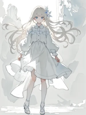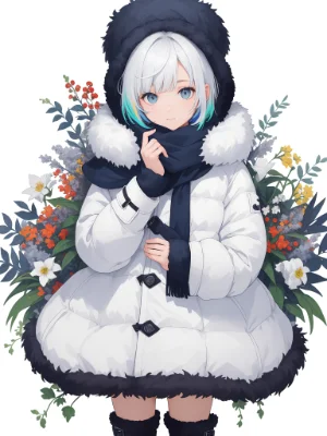 (white background:1.3), (extremely detailed fine touch:1.3), ///, girl, short hair, Faux Fur Hood, navy knee-length quilted puffer coat, Faux fur-lined hood, chunky knit scarf, knee-high boots for a winter, full body, (many colorful small flowers:1.3)