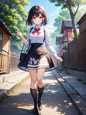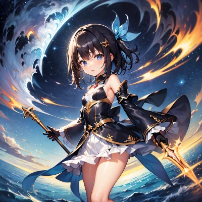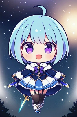masterpiece, best quality, extremely detailed, anime, girl, skirt, magical girl, girl, ahoge, bobcut, garter belt, blue hair, purple eyes, original character, my child, deformed, chibi character, personification, fantasy, colorful, magic, winter, night, starry sky, smile, sword fighting,