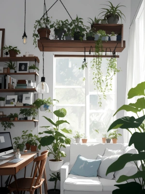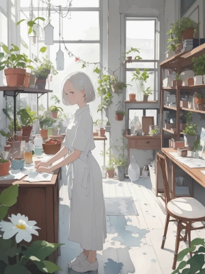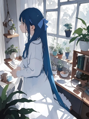 absurdres, highres, (white background:1.3), (watercolor,:1.1) (pale tone:1.3), (rough sketch:1.3), (blurry:1.3), (smudge:1.3), (hard light, studio light, light rays, dappled light, reflection, shadows, ray tracing:1.0), ///, kawaii girl, blue long hair, hairpins, ribbons, shirts, flower, upper body, <lora:flat2:1>, sofa, room, window, cushion, vase, lamp, curtain, desc, (pc:1.3), houseplants, desk, chair, lamp, bottle, shelf, stylish cafe