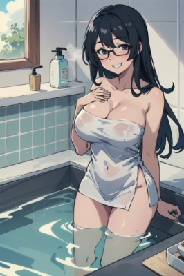 masterpiece, best quality, extremely detailed, anime, girl, glasses, Wrapping body in a towel, big breasts, smile, black hair, long hair, in bathroom, go into the water, bare one\@!@s teeth, lots of steam, <lora:sensualface_type2:1> <lora:eyecolle_mokuren_v100:1> ,,