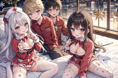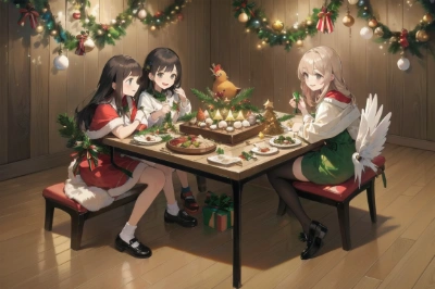 masterpiece,best quality,ultra detailed beautiful face and eyes,(3girls),(high school student),(cute winter clothes),(cute miniskirt),(cute panty),((cute interior shoes)),(a happy smile),((home party)),((a room decorated with christmas)),(((wood wall))),(((flooring floor))),((((Christmas food, Christmas cake, and roasted bird are on the table)))),(panty_peek),,