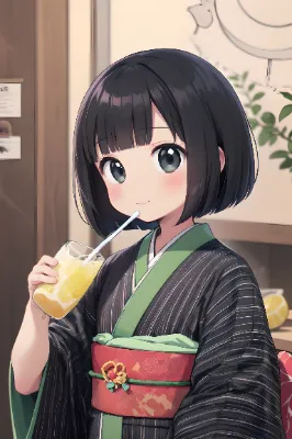 (((very longest hair))),black hair, smile,straight Hair,hair ribbon,mintgreen stripe,Black Eyes,flat chest,straight Across bangs,princess Cut, Very Long Sideburn,roundry Head,Droping eyes,,cute,Meekness,Bob Cut,long back hair,12 years Old,Kimono, christmas,Santa\@!@s big bag,