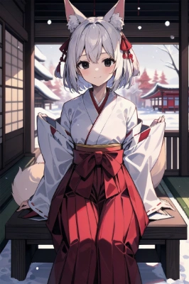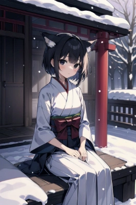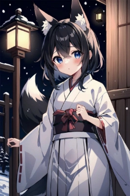 masterpiece, best quality, extremely detailed, anime, girl, skirt <lora:hairdetailer:0> <lora:eyecolle_odamaki_v100:1> black fox girl,little girl, Shrine Maiden Outfit,White top kimono,long skirt,black eye,snow, face focus,